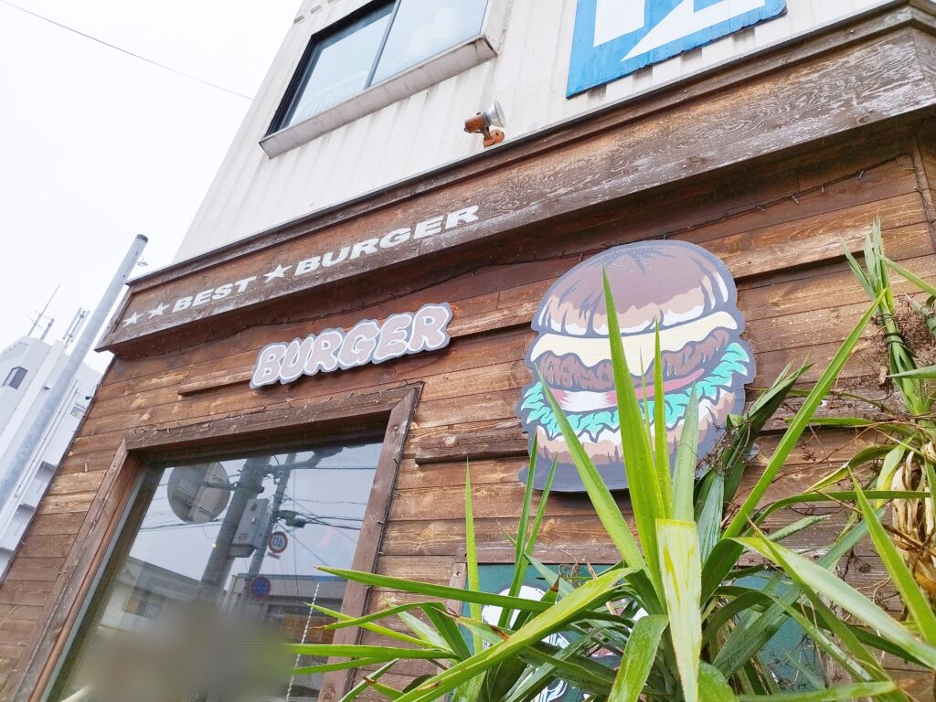 木の温かみを感じる茶色い外観に、大きなハンバーガーのイラストと星条旗がかかげられているのが目印ですよ。